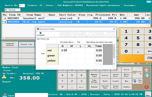 中英文版服装零售前台——POS开单颜色尺码二维表
