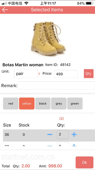 中英文服装APP端销售管理——销售开单颜色尺码表