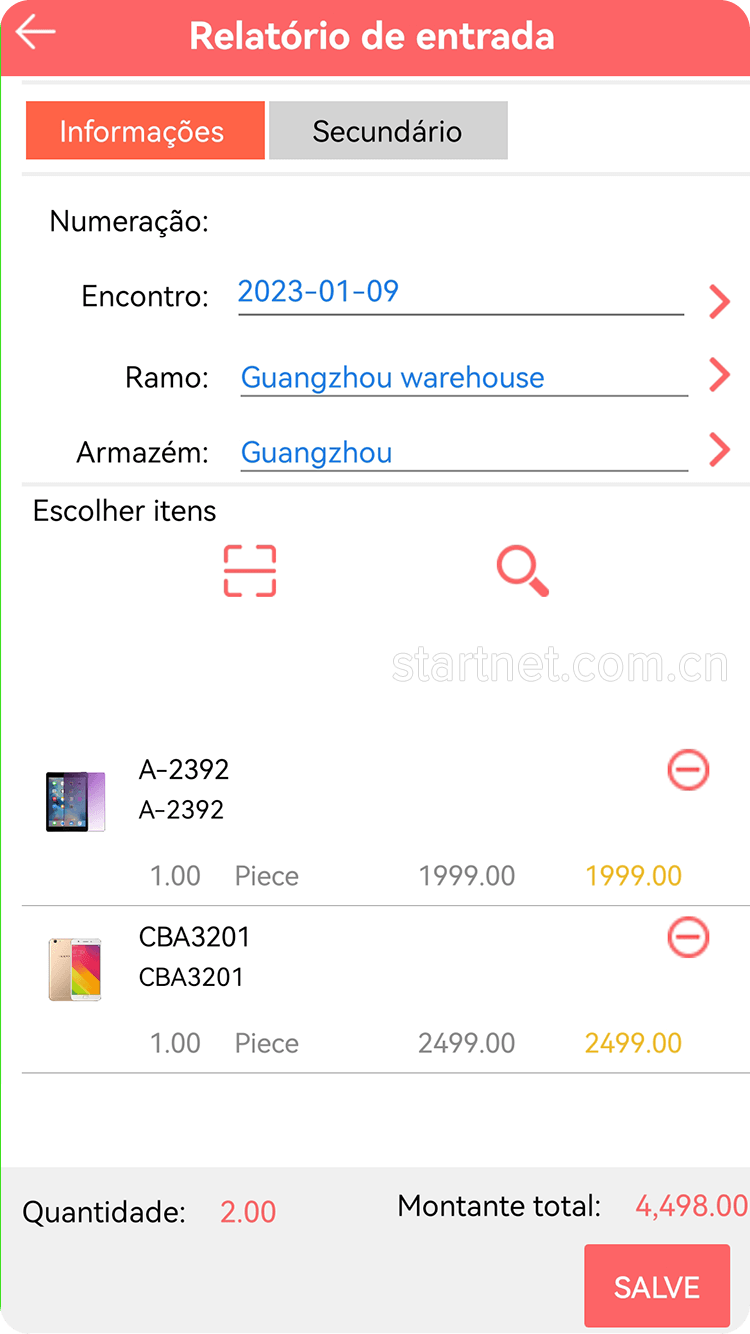 葡萄牙文APP端库存管理——入库单葡萄牙文版界面