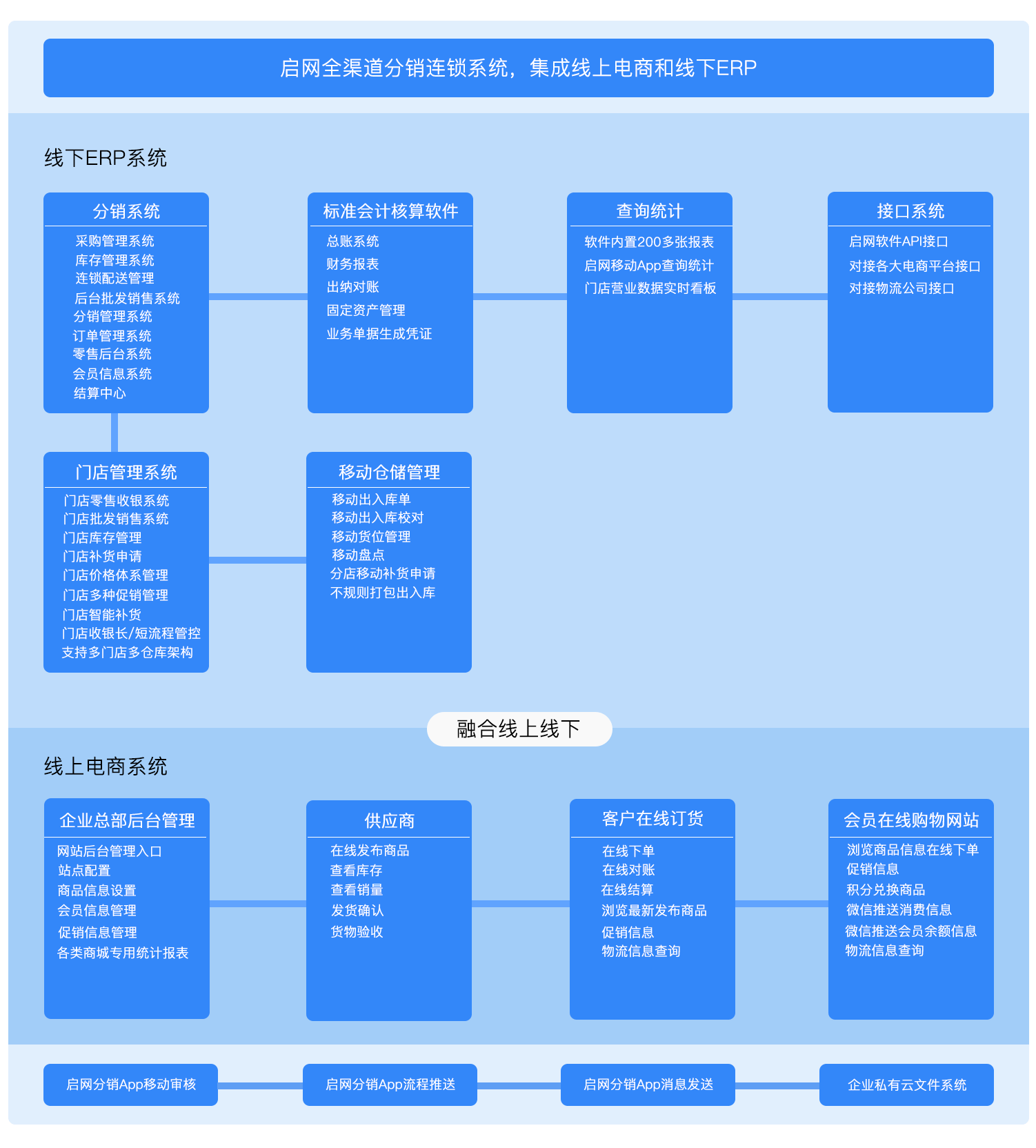 全渠道分销连锁,可整合B2C购物商城、B2B在线订货系统、微信公众号等,线上线下一体化。